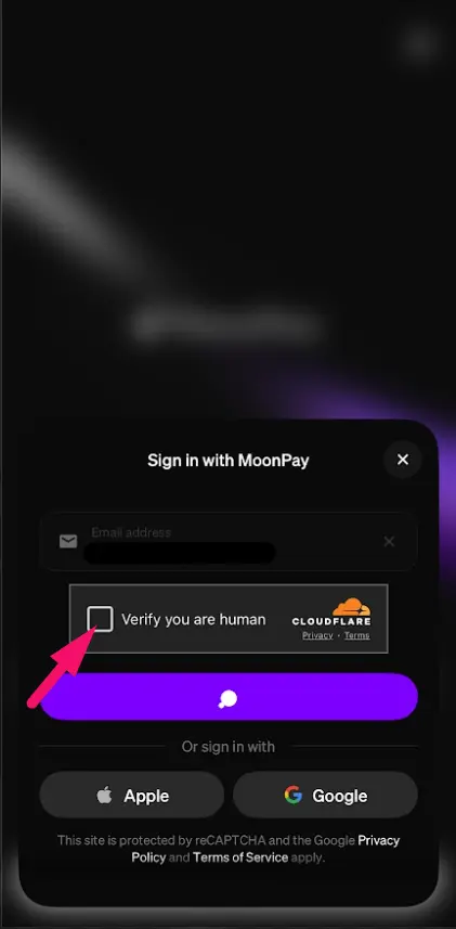 use your apple / google to access, or Enter your email and press on Continue. After that, press on the square Verify you are human.