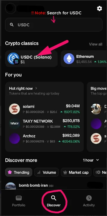 Click on “Discover,” then click on the search bar and search for “USDC (Solana)” (then choose it).